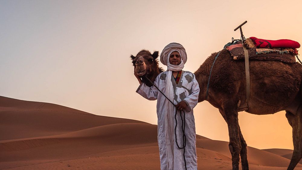 Hier zie je Omar met twee kamelen in de Sahara woestijn. Tijdens zonsondergang met hem op pad geweest met deze twee kamelen en foto's gemaakt.