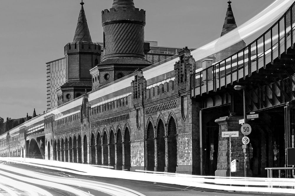 Street and subway traffic at the famous Berlin Oberbaum Bridge, which here the Spree River connects the districts of Kreuzberg and Friedrichshain.