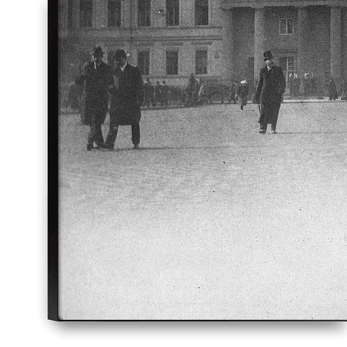 People: There are people walking in clothes of the time. Some people wear hats and long coats.
