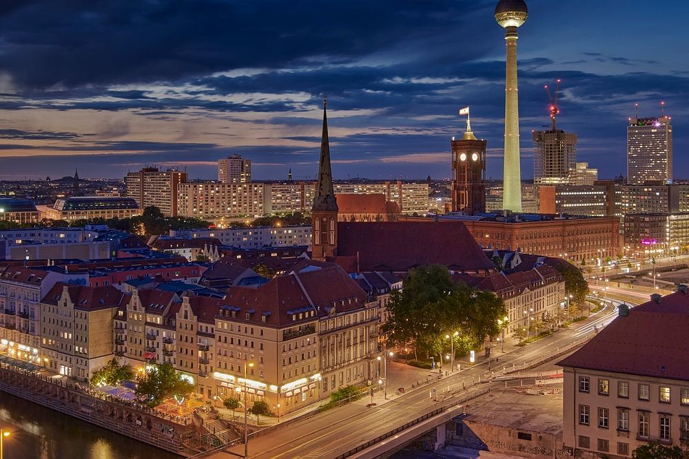 A panorama of a sunset in Berlin with views including the Nikolaiviertel, Alexanderplatz, Berliner Dom and the Fernsehturm. A familiar image of the skyline of the German capital Berlin.