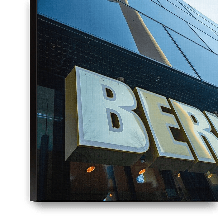 The photo shows the Berlin television tower in combination with a modern glass façade and the striking lettering "BERLIN" at the bottom of the picture. The photo was taken under a clear sky and in optimal daylight. The television tower, one of Germany's best-known landmarks, is reflected in the smooth surface of the building and is…