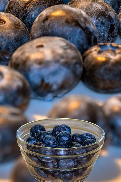 A glass bowl full of deep blue blueberries is sharply in focus in the foreground, whilst behind it a surreal wall of seemingly gigantic fruits towers up. The interplay of perspective makes the blurred berries in the background appear like floating planets in an indigo-coloured cosmos that literally envelops the viewer. Warm reflections…