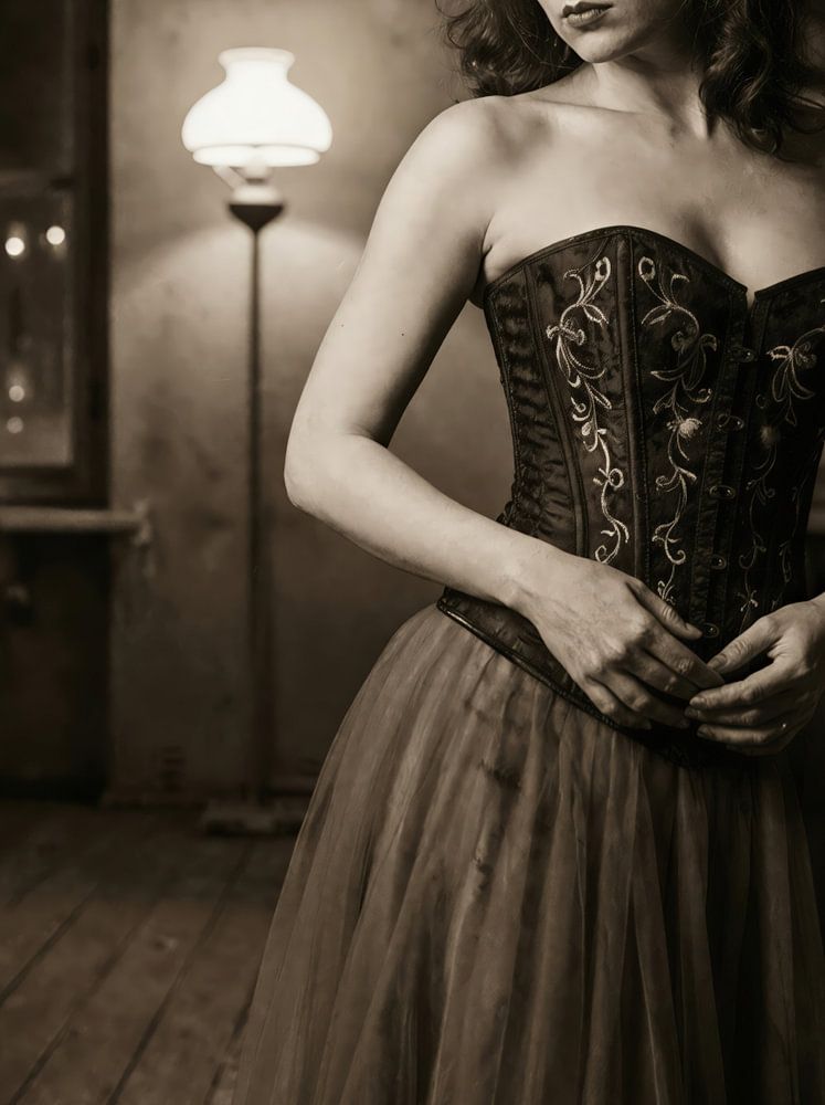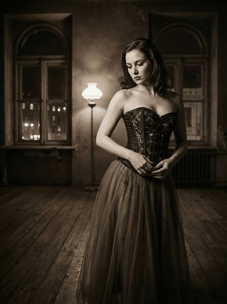 This picture thrives on the quiet tension between presence and withdrawal. The woman stands alone in the room, but the room does not seem empty - it is filled with the past. The worn floorboards, the high windows, the dull lamplight tell of nights that have seen more than they reveal.