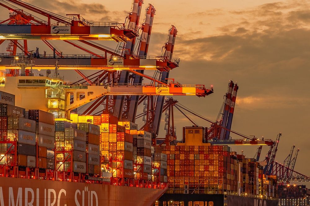 A majestic view of Burchardkai in Hamburg at dusk: the setting sun bathes the harbour in a warm, golden light that is reflected on the stacked containers and the huge hulls of the cargo ships.