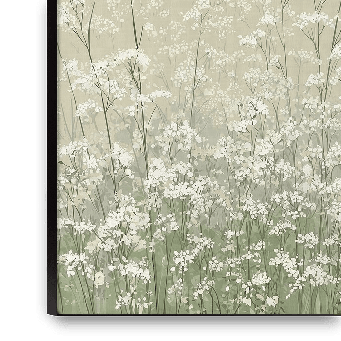 Delicate white blossoms float like a cloud of light over a soft beige background that fades to light green at the bottom. The flowers, presumably inspired by gypsophila or wild umbellifers, are rendered with fine lines and seem to dissolve into their surroundings. There is a sense of transparency and weightlessness – as if this bloom…