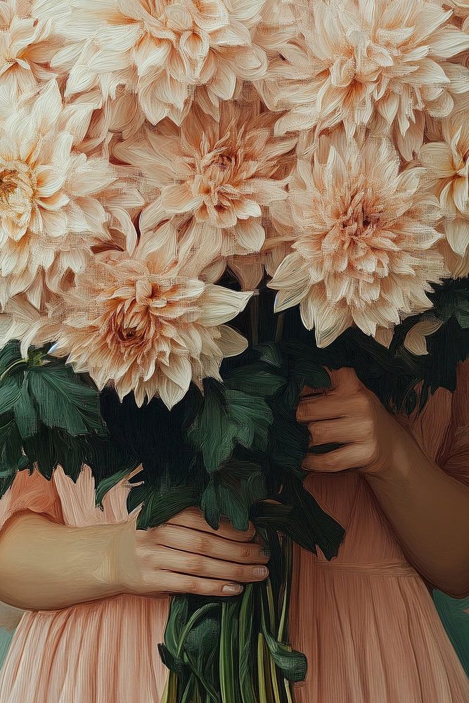 A poetic image in which a peach-colored dress merges with a lush bouquet of creamy white dahlias. The composition exudes pure romance, with the soft pastel shades and abundant flowers creating a dreamy atmosphere. The photographic style is timeless and ethereal, with a perfect balance between the delicate dress and the full, velvety flowers.