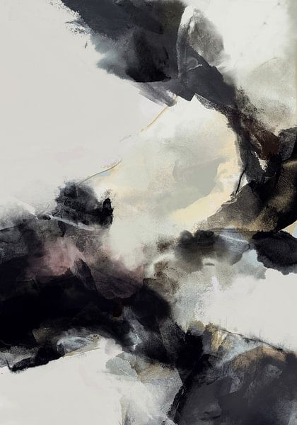 A masterpiece of Lyrical Abstraction with deep Eastern sensibilities, symbolising the breakthrough of thought beyond material boundaries into a higher dimension. Against a vast, ethereal white void, powerful ink blacks and soft smoky grey washes surge upward, creating a sense of grand, formless beauty. Subtle hints of lavender and pale…