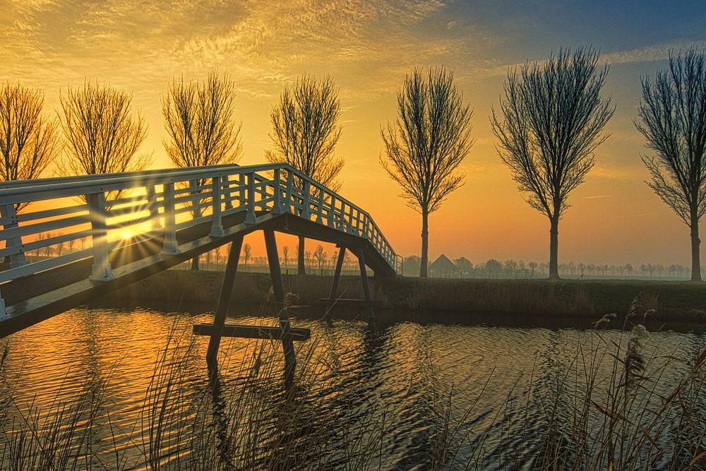 Bicycle bridge at sunrise near Avenhorn by peterheinspictures