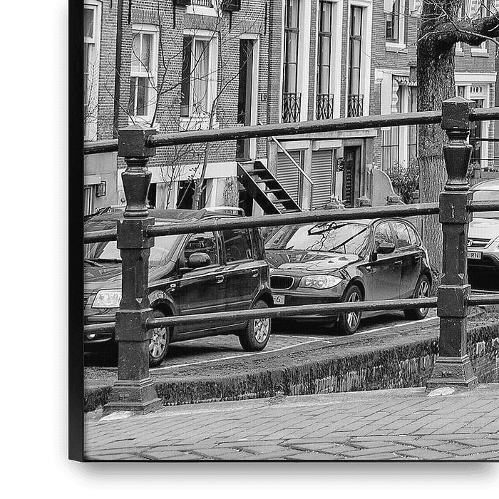 A photograph in the unique style of Don Fonzarelli. A bicycle on a bridge across the Reguliersgracht in Amsterdam.