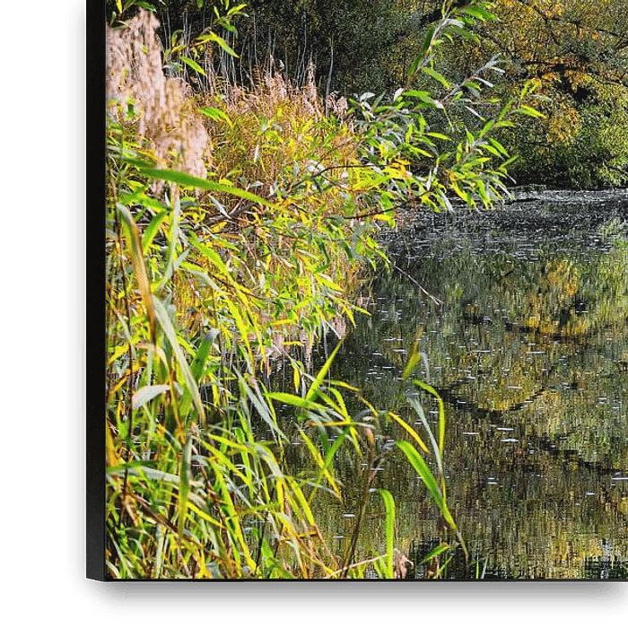 Buy this landscape artwork Biesbosch autumn colours seen from the water by Kees Dorsman on canvas, ArtFrame, poster and wallpaper, printed on demand in high quality.