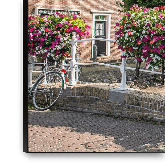 Cycling to Sloten, a picturesque town in Friesland. The bikes are parked on the bridge over the canal through the town that has a protected cityscape. Flower boxes on the bridge railing give colour to the whole. Sloten (Sleat) is one of the Frisian eleven cities.
