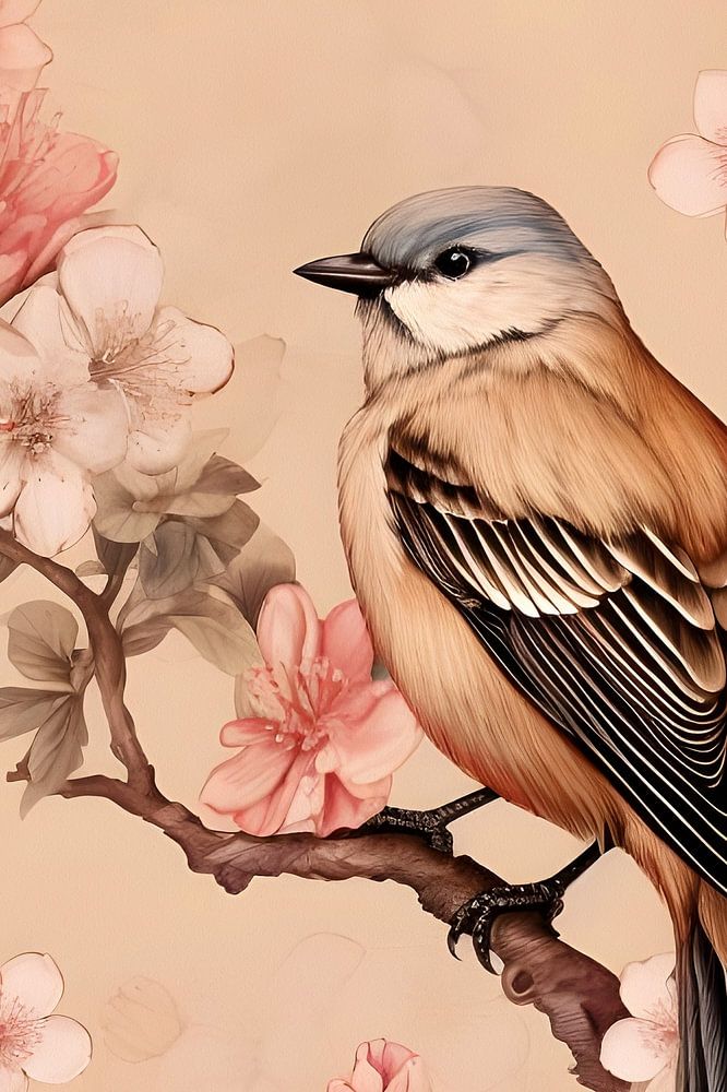 Buy this flower art Bird among blossom flowers by But First Framing on canvas, ArtFrame, poster and wallpaper, printed on demand in high quality.