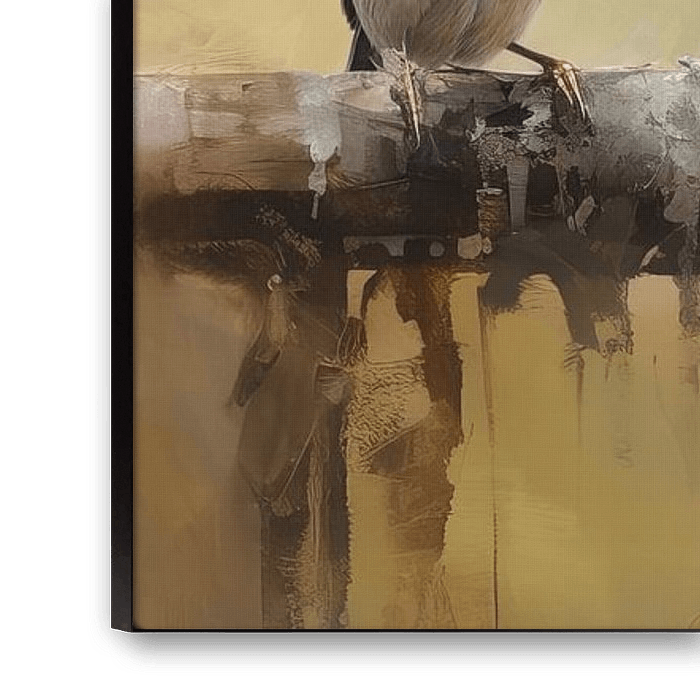 Bird Art Beige - With an endearing realism, this scene presents a row of sparrow-like birds resting on a branch. The soft transitions from warm beige and brown tones to subtle shades of grey create a serene feel, while hints of blue in the background add a fresh touch. Each bird is rendered with care, so that they almost seem to hop out of the canvas.