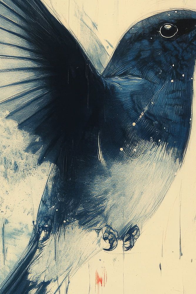 This elegant illustration shows a bird caught in a moment of graceful ascent, rendered in deep blue tones that flow smoothly into subtle brush marks and splashes. The composition exudes lightness, while the bird's dynamic wing movements and sharp eye suggest strength and focus. The soft background enhances the sense of floating and stillness, as if the bird is detaching itself from the canvas itself. This artwork is particularly suited to minimalist interiors with a love of nature, detail and visual tranquillity.