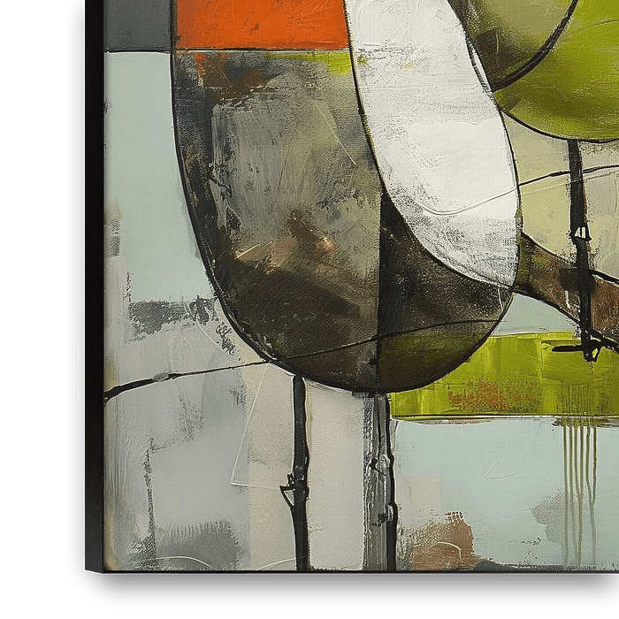 Abstract and modern work 'bird meeting'. Neutral tones combined with colour for a vibrant and timeless effect.