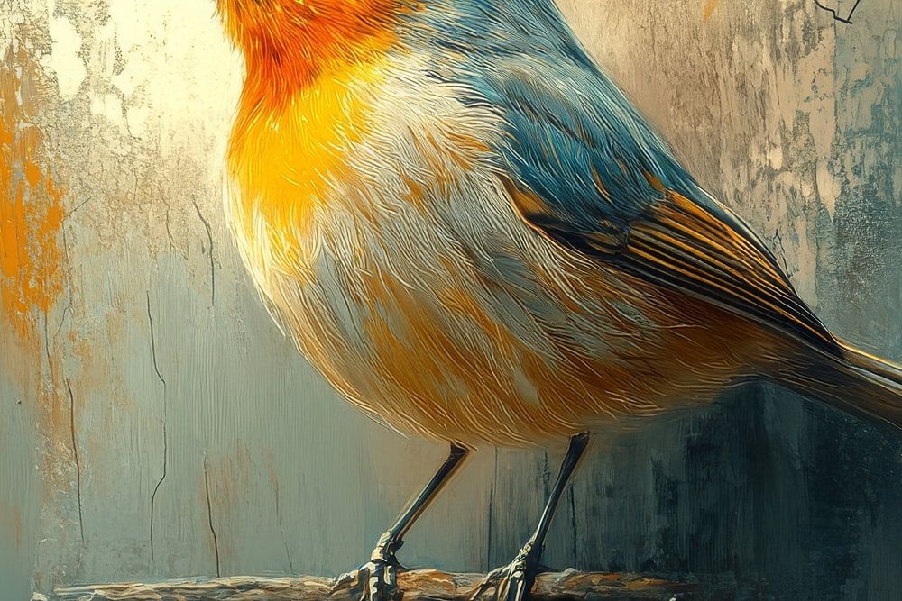 This enchanting painting shows a robin-like bird on a thin branch, surrounded by an expressive background of blue, orange and beige brushstrokes. The fine detailing of the feathers contrasts beautifully with the rough texture of the background, making the bird seem almost tangible. The warm orange breast and soft light create a sense of autumnal calm and hushed elegance. A perfect complement for interiors that love nature, sophistication and rich colour harmony.