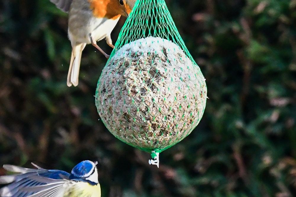 Feeding robin and blue tit in a garden in the North of Holland / European robin and blue tit feeding in a garden in the North of Holland