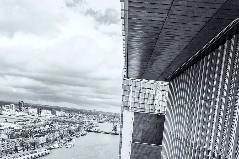Uitzicht vanaf grote hoogte vanuit De Rotterdam op het Noordereiland