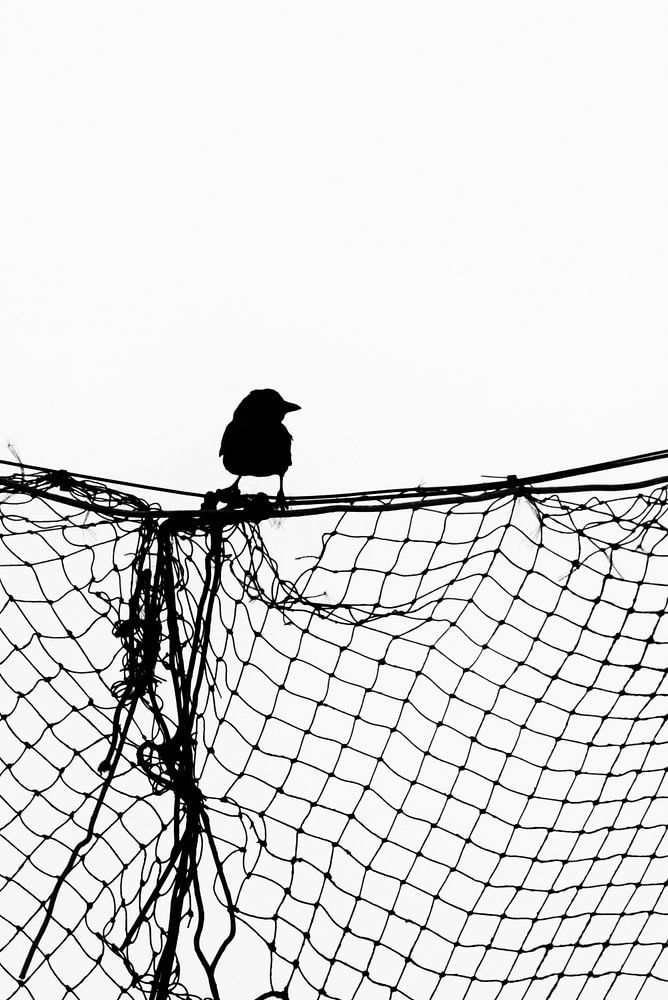 The image showcases a black and white silhouette of a bird perched on a net against a plain white background. The net is a dark, intricate mesh with a slightly torn section, adding a touch of texture and imperfection. The bird's silhouette is simple yet striking, creating a sense of solitude and contemplation.