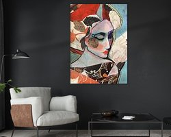 Modern reproduction of a portrait of a Geisha, made with pastel crayon, India ink and pieces of printed paper.