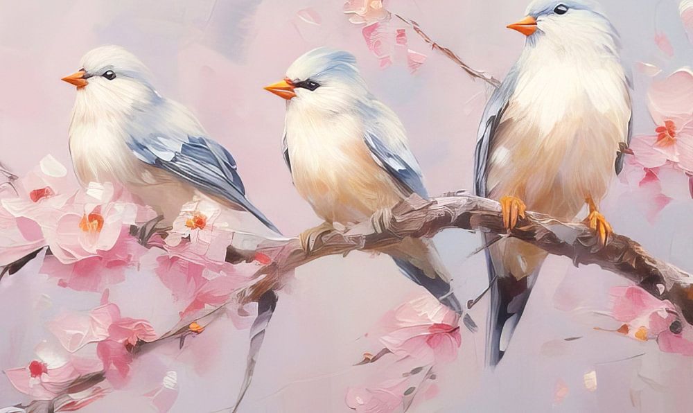 Five little birds on a cherry blossom branch with pink cherry flowers. The birds are pastel white, blue, grey. The background is faded with palette knife technique. It is a sophisticated oil painting. Fitting with various styles and trends.