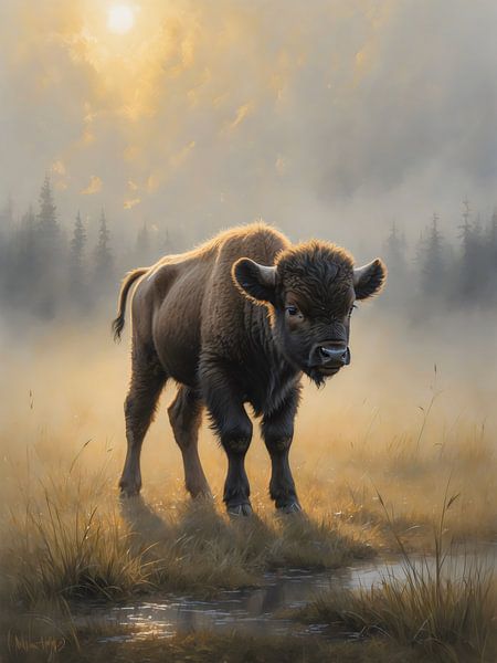 This work depicts a young bison in the early morning light, standing in an open landscape where mist and sunlight gently meet. The sky glows softly, the land is silent, as if the world has not yet decided to move. Everything in this composition exudes tranquillity, space and the beginning of strength.
