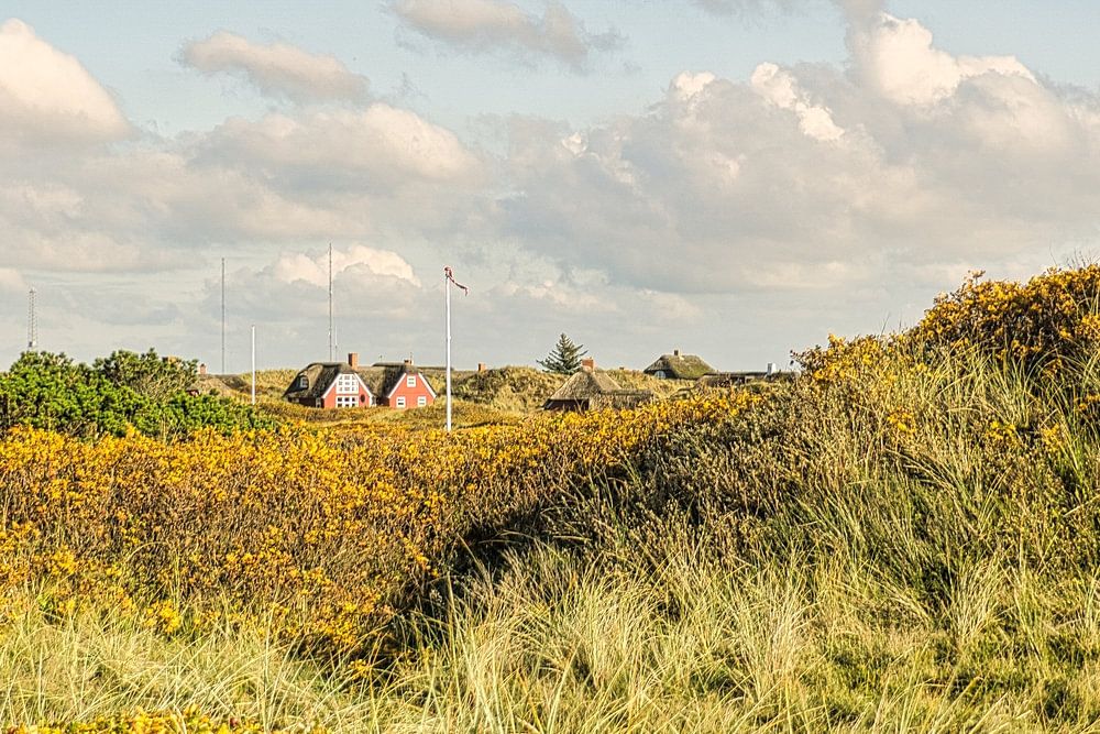Blåvand dune landscape in Denmark on the North Sea. Cloudy sky with autumn landscape littered with rosehip bushes.