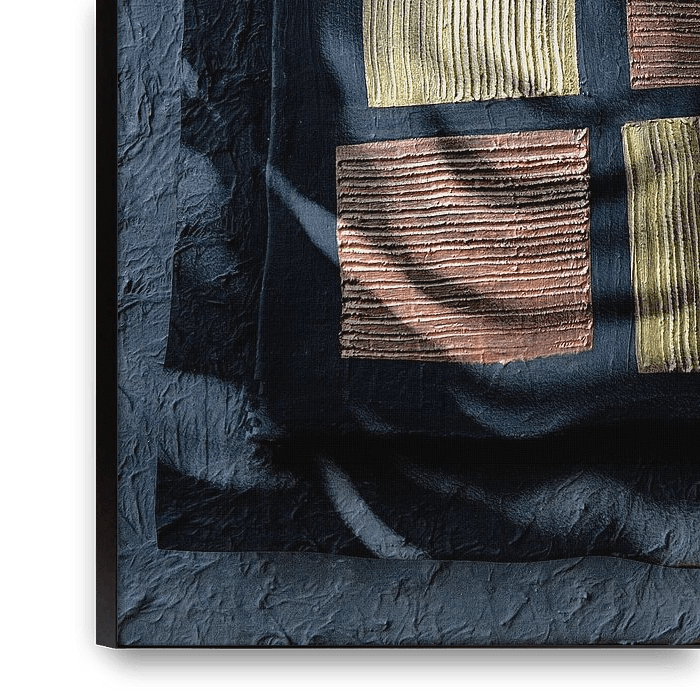 Abstract painting with squares in the colors black, bronze and gold.