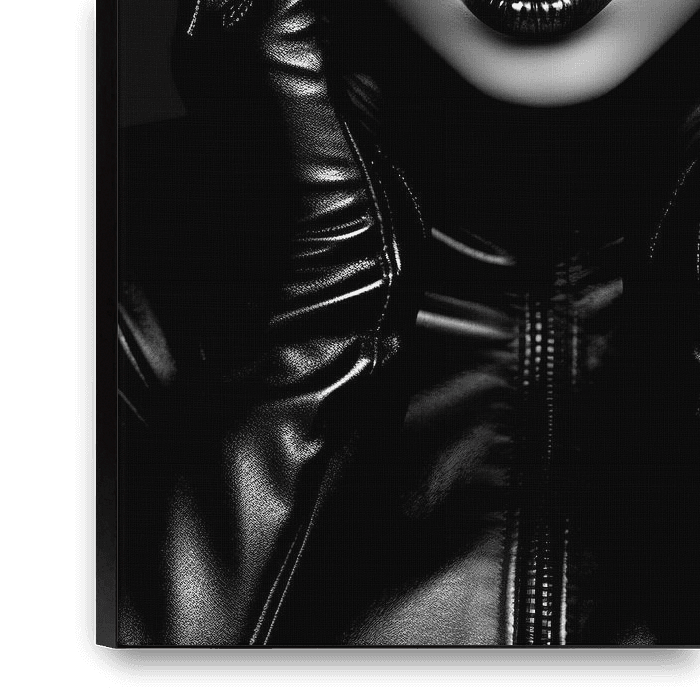 Expressive portrait of a woman in a black leather suit with black leather gloves. Film Noir style.