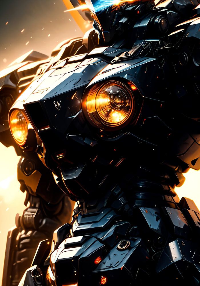 Black metalic robot , sci fi mecha anime style illustration with explosion in the background , suit for your room and gaming pc or dekstop setup for you
