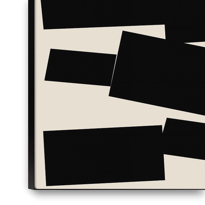 This modern abstract graphic artwork features simple shapes in black and white, inspired by retro design and architecture. Its minimalist style makes it perfect for any living space. The basic yet sophisticated look of this artwork is ideal for those who love modern wall art. This piece is a great addition to any contemporary living…