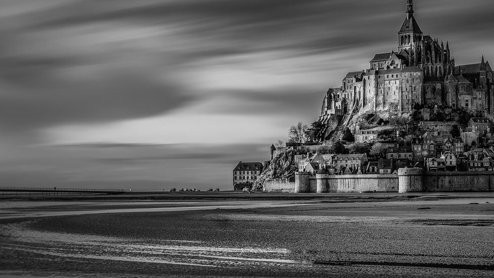 Black and white. It's windy at sunset. The clouds draw long stripes through the sky. On the ground, in the water, a vague reflection of Mont Saint Michel is visible.