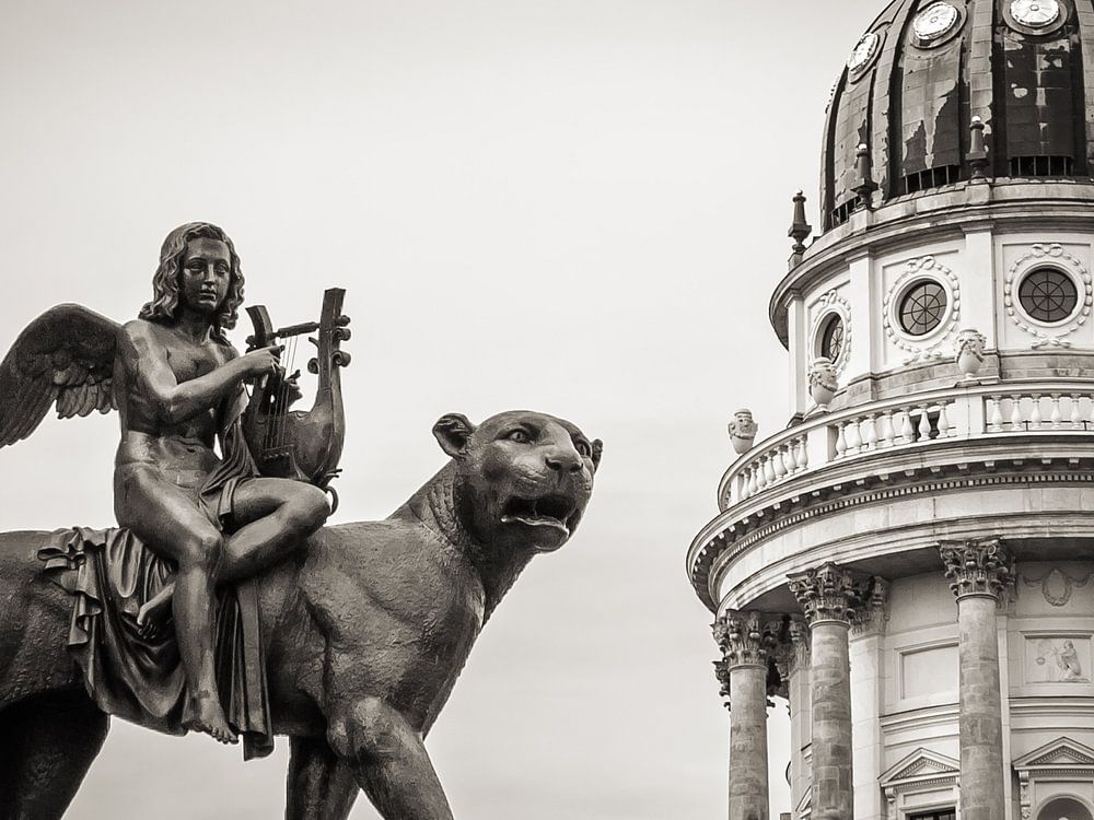 A black and white impression from the Gendarmenmarkt square in Berlin, with the French Cathedral and a bronze sculpture by Christian Friedrich Tieck in front of the Konzerthaus.