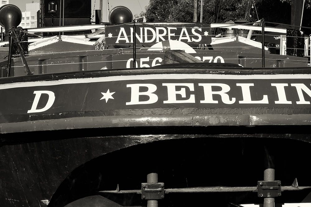 Berlin in black and white: The steam tug “Andreas” in the Historischer Hafen museum harbour.