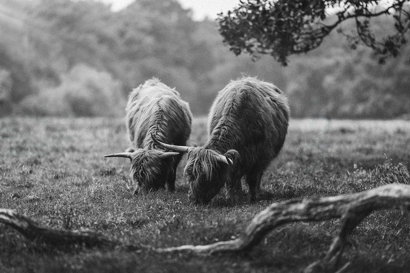 Two Scottish Highland cattle, captured in a peaceful moment in the countryside. The black-and-white treatment emphasises the texture of their coats and the tranquil atmosphere of the landscape.