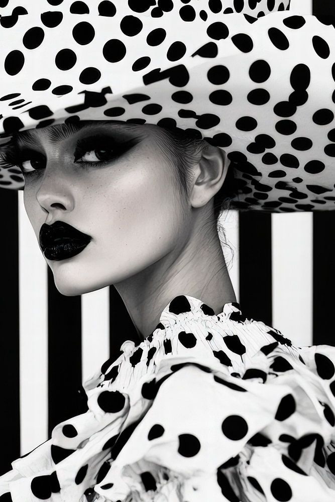 An elegant appearance in a monochrome dress, topped off with a striking, dotted hat, attracts everyone's attention. The bold contrasts and playful ruffles add a creative touch to the room. Perfect for a stylish living room or a modern studio where art and fashion take centre stage.