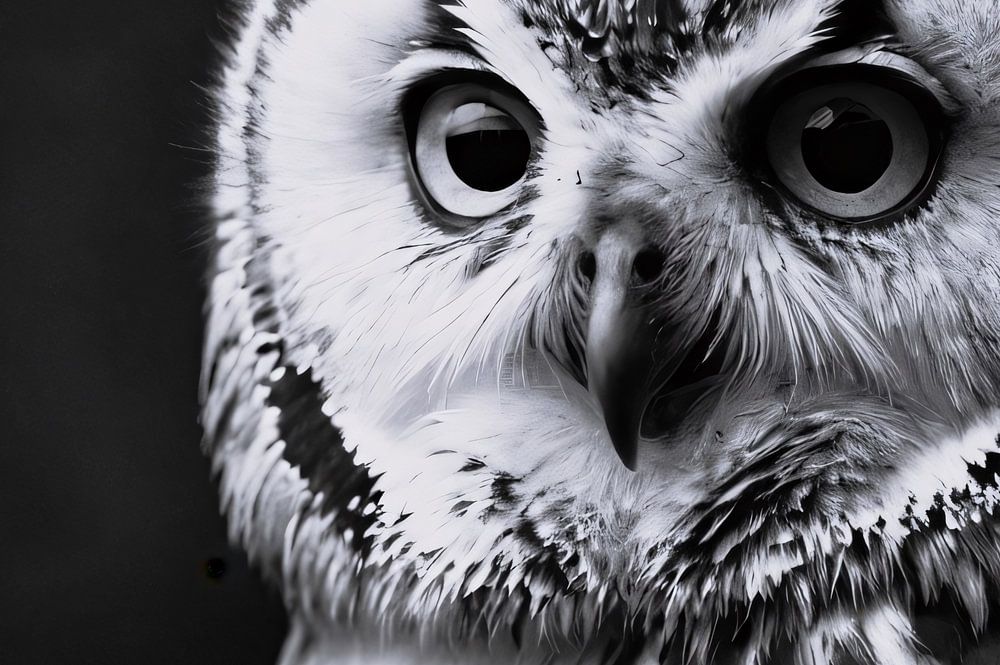This beautiful design shows an impressive black-and-white image of an owl, full of details and with an intense gaze. The textures of the feathers and the contrasting light-dark effect emphasise the calmness and strength of this bird. The owl is perfectly captured with a realistic approach, revealing every detail, from the sharpness in the eyes to the fine lines in the plumage. This design adds an elegant and timeless element to any room, perfect for lovers of nature photography and animal portraits. The black and white colour palette ensures that this artwork fits into a variety of interiors, such as an office or bedroom.