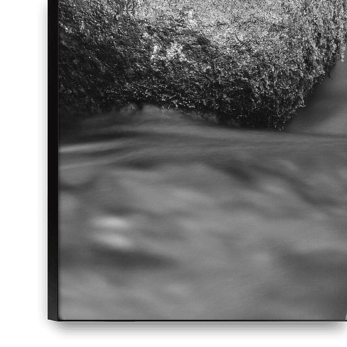 Abstract colour photograph of rocks or stones with moss lying on them in flowing water photographed with a long shutter speed. This image was taken near a waterfall in Germany's Black Forest.