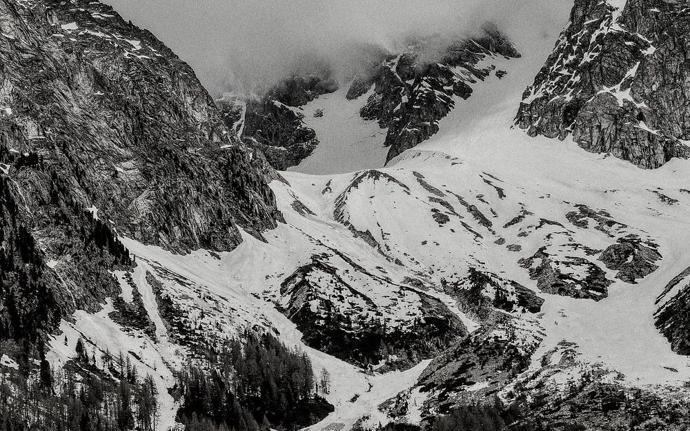 A black and shite photo of the Dolomites in Italy. There is snow on the slopes of the mountain. Trees are in the foreground. The tops are covered with clouds.