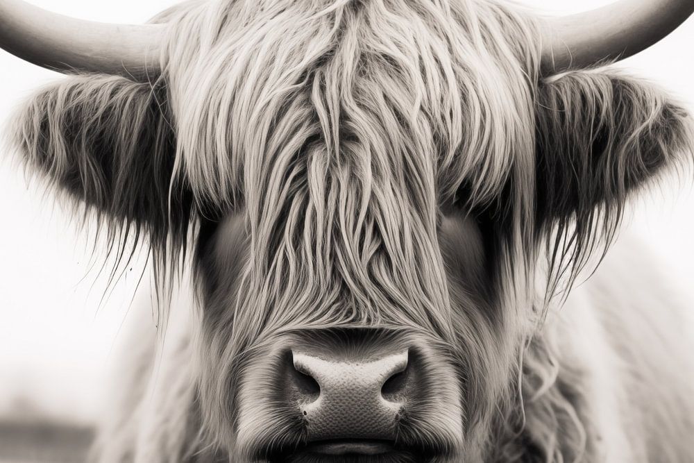 About "Black and white photograph of a Scottish Highland cattle in portrait"