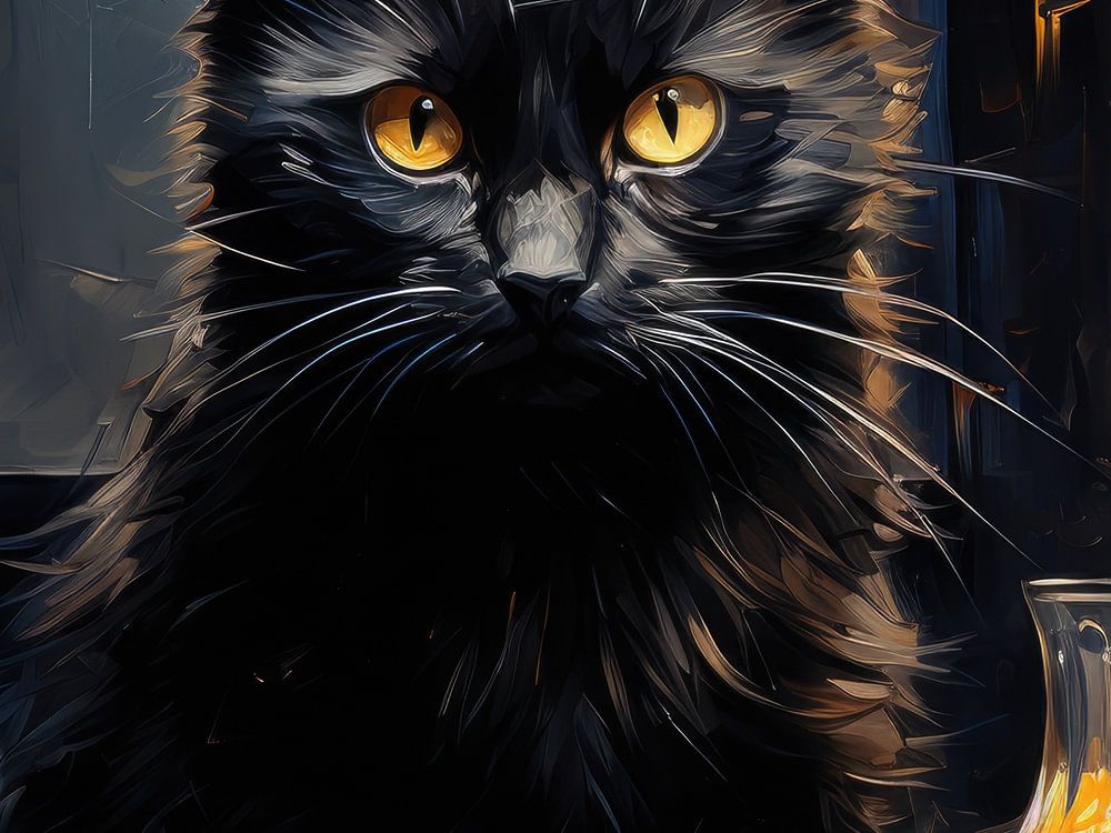 Black cat sitting at table and drinking in café. Cute kitten, street café and starry night. Inspired by Vincent van Gogh. Painting of a colourful street view on a starry night.