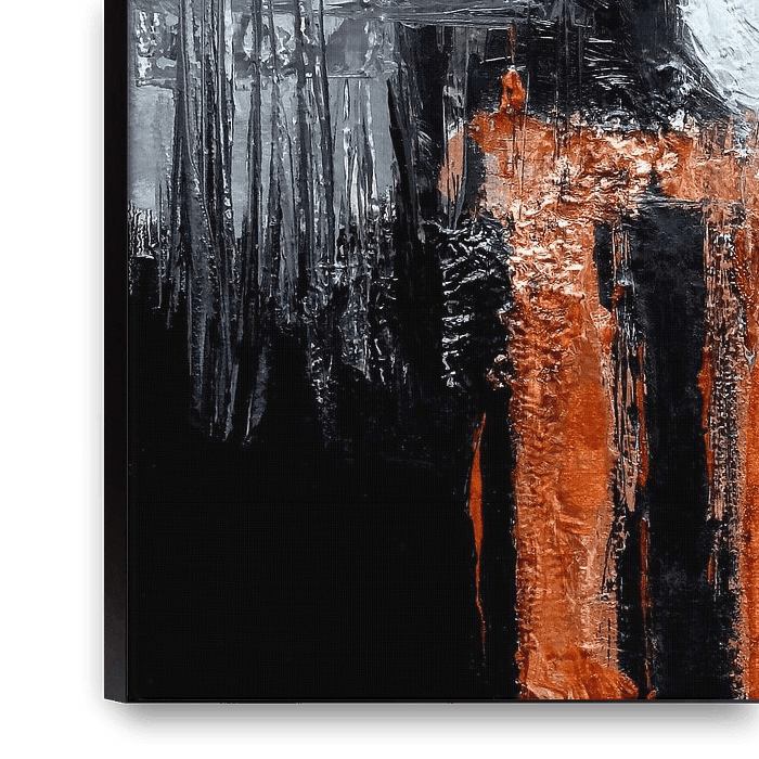 This abstract painting features a bold interplay of industrial tones and vibrant copper accents. The composition is dominated by textured layers of gray and black, which create a sense of depth and structure. The copper highlights bring warmth and energy to the piece, providing a striking contrast to the cooler, muted tones. Vertical…