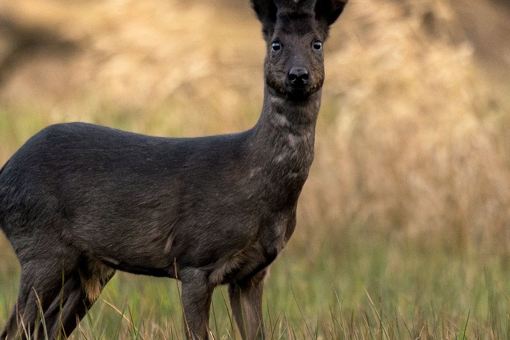 There suddenly. One of the rarest specimens in the realm of deer. A beautiful dark apparition. Am I seeing correctly? My heart rate rises. I see it right. A black roe deer!