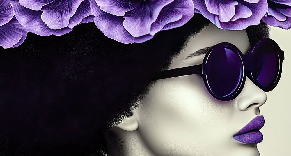 This portrait shows a side view of an elegant black woman with sunglasses and an afro adorned with purple flowers. Her profile exudes confidence and style, while the purple flowers add a subtle elegance and beauty. The sunglasses give the woman a mysterious flair and enhance her aura of coolness and sophistication. The soft curves of the afro and the vibrant colours of the flowers create a harmonious composition that accentuates the woman's natural beauty. This image invites the viewer to celebrate the diversity and grace of black beauty and enjoy the artistic interpretation of fashion and style.