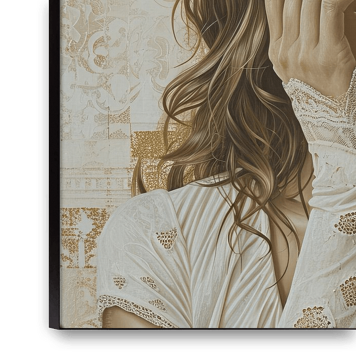 Als je verder kijkt, zie je dat het haar losjes golft langs de schouders, met losse lokken die leven geven aan het portret. De verf voor het haar is fijn en gelaagd aangebracht; individuele strengen lijken te glanzen, maar nooit te blinken — het is meer een fluistering van beweging dan een knipperend licht. De mouwen van haar blouse zijn lang en versierd met kantachtige patronen en kleine uitsparingen; die kant echoot de structuur van de blinddoek en zorgt voor een ritmische herhaling van textuur. Die twee terugkerende patronen — blinddoek en kantmouwen — werken als visuele antwoorden op elkaar: de ene verbergt, de andere siert, beide verbinden mondelinge stilte met uiterlijke verzorging.