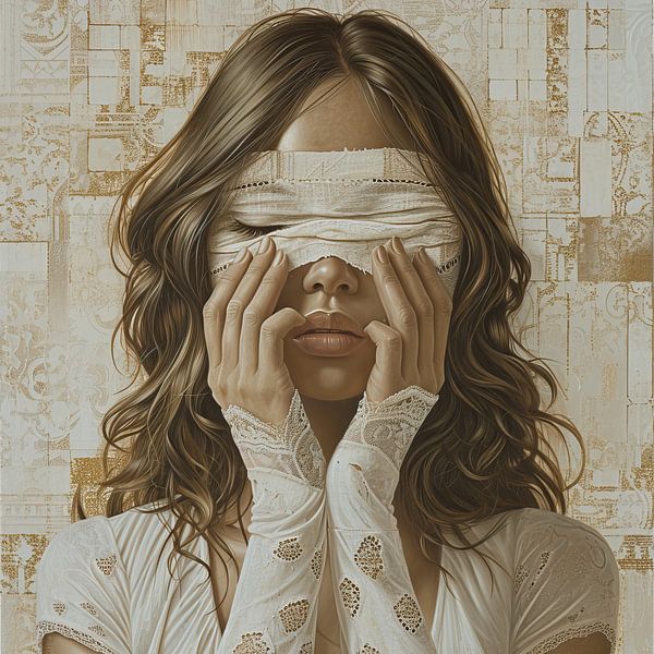 Blinddoek Portret | Sluier - Dit schilderij toont heel direct twee opvallende elementen die elkaar versterken: een vrouw met een wit gebonden blinddoek over haar ogen en haar handen, in kant gehuld, die de rand van die blinddoek voorzichtig aanraken. De eerste indruk is een stille concentratie — niet dramatisch, eerder ingetogen. De…
