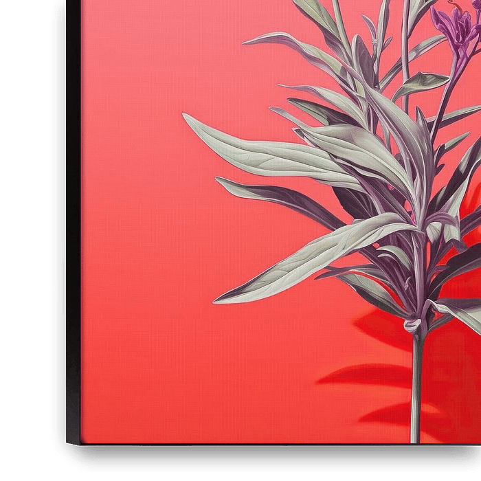 Bloom - This stylised artwork depicts two purple flowers against an even pink background, giving a modern yet natural feel. The flowers are realistically rendered with an attention to detail in the leaves and blossoms, while the use of colour is contrasting with a strong emphasis on the purple and pink tones.