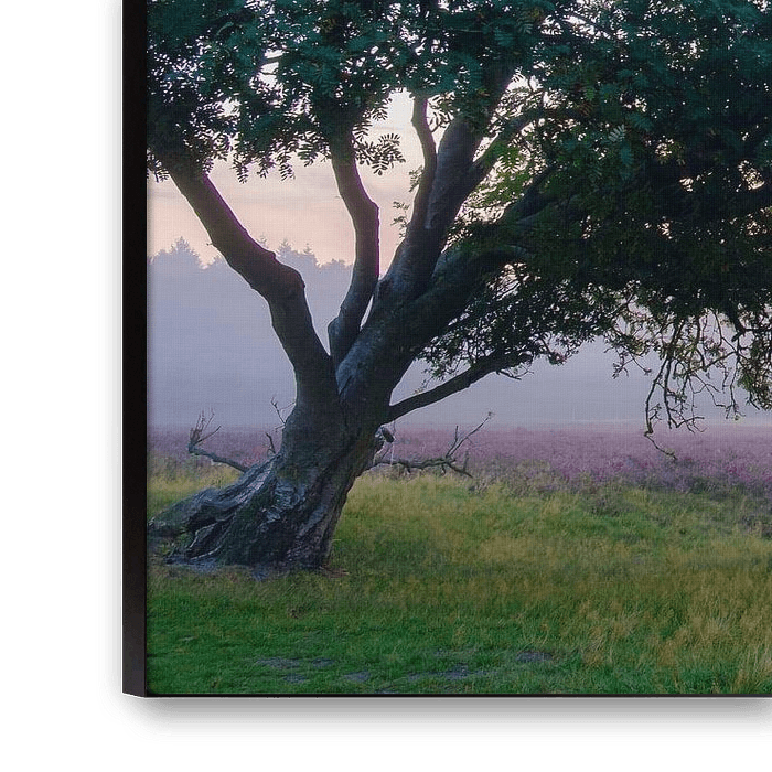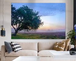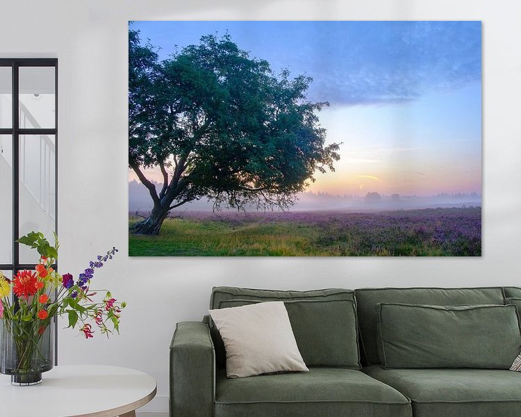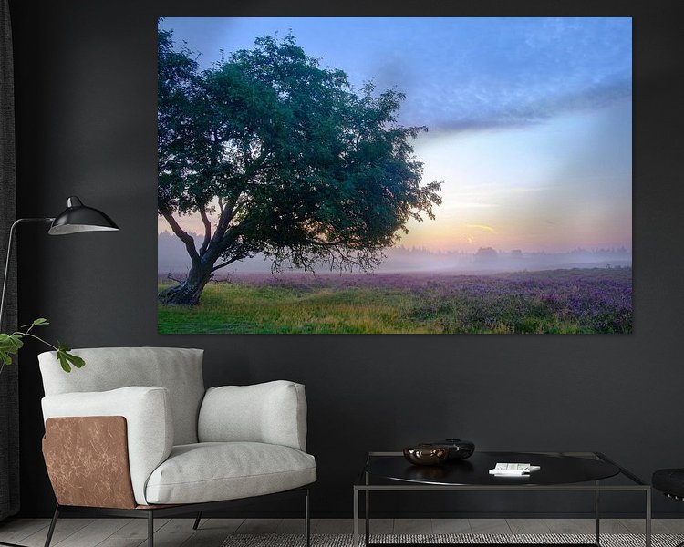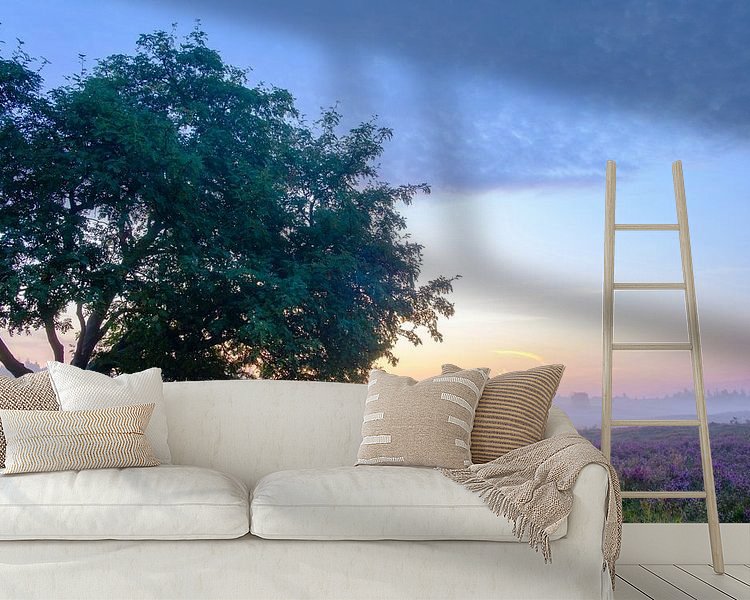 Blooming Heather plants in Heathland landscape during an early morning sunrise in summer.