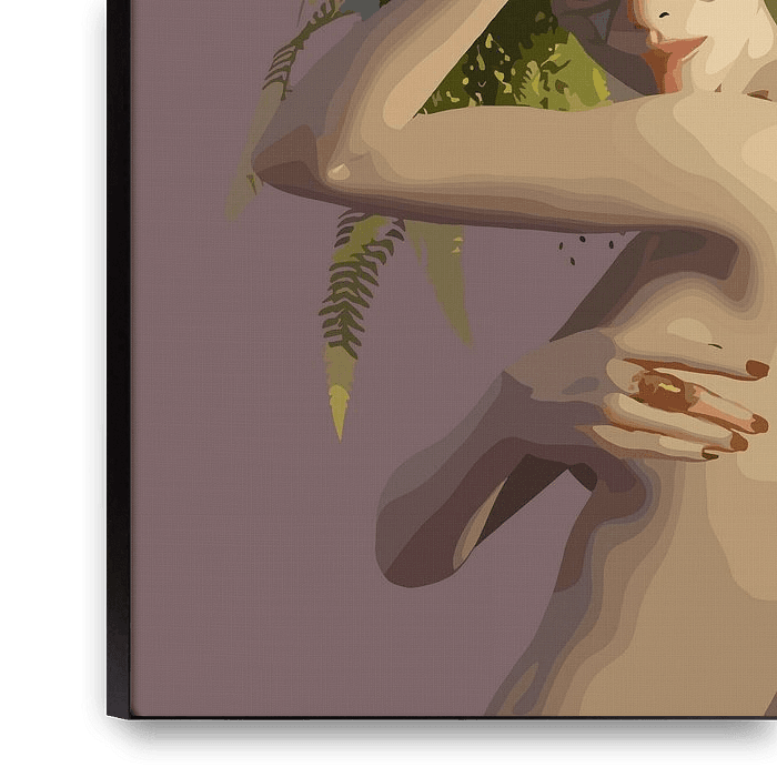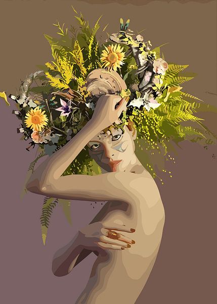 This artwork presents a human figure emerging in harmony with a lush crown of flowers and foliage. The body is simplified and softly abstracted, allowing the floral arrangement to become the emotional center of the composition. Earthy greens, muted yellows, and warm skin tones blend seamlessly, creating a natural flow between the human…