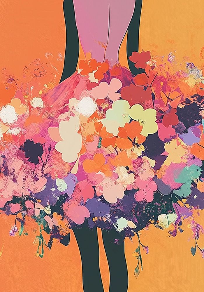 "Blooming Silhouette" captures a woman from behind, against a background of warm orange and yellow hues. Her anthracite-coloured silhouette is a powerful contrast to the vibrant background, while she is elegantly moving. She is wearing a pink top and a dress decorated in impressionist style with an explosion of colourful flowers. These flowers seem to embrace the dress, creating a colourful and cheerful effect. The combination of the colourful flowers and the subtle colours of the background creates a visual feast, in which the woman is absorbed in a lush blooming fantasy.